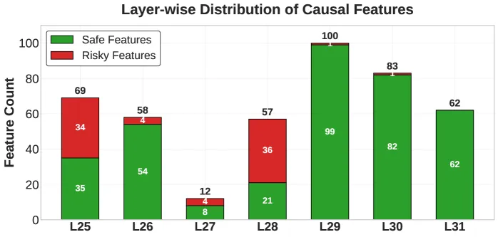 They also found a layer pattern. Protective features concentrated in later layers 29 to 31, while risky features clustered earlier, in layers 25 to 28. The model thinks about the reward first, then considers risk. Harmful prompts can override the conservative bias baked into the later layers.