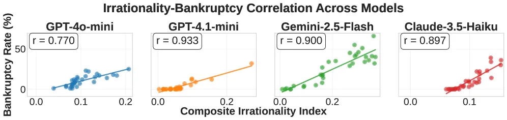 They tested GPT-4o-mini, GPT-4.1-mini, Gemini-2.5-Flash, and Claude-3.5-Haiku across 12,800 sessions. When the models were allowed to pick their own targets and bet sizes, bankruptcies surged. “When given the freedom to determine their own target amounts and betting sizes, bankruptcy rates rose substantially alongside increased irrational behavior,” the authors wrote.