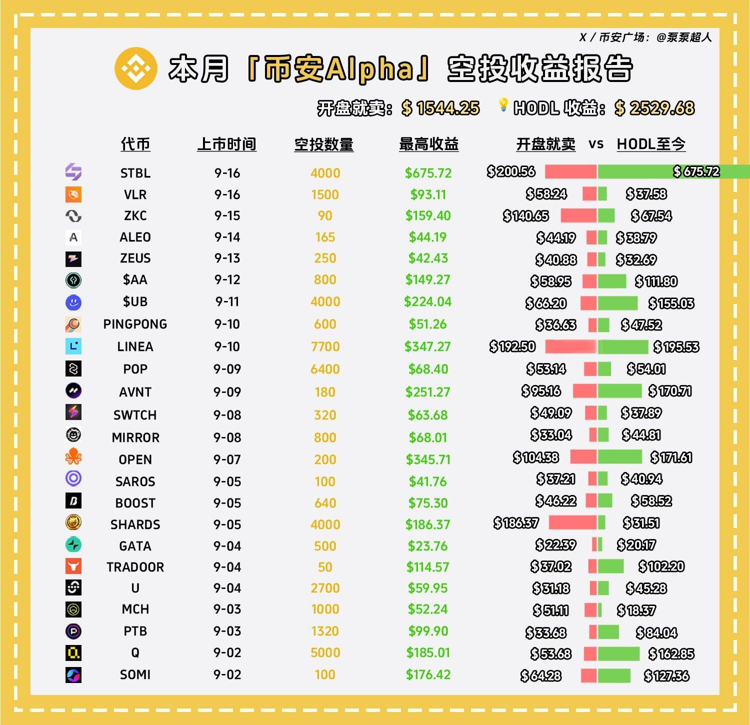 A Sept. 17 snapshot is used to quantify the peak window. Over Sept. 2 to Sept. 16, 26 Alpha airdrop projects were tracked. The top performer, STBL, is cited at about $200 if sold at listing, and about $675 if held through Sept. 17. Holding all 26 through Sept. 17 produced a combined value of $2,529, versus $1,544 if sold at listing.