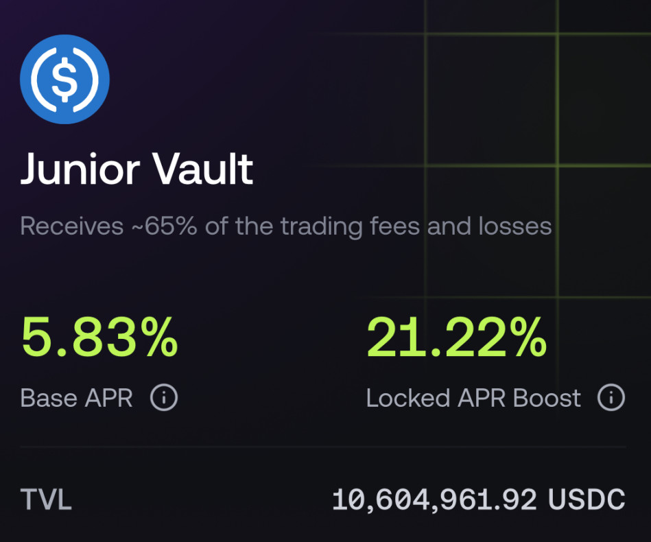Risk splits between vaults. The Junior vault absorbs up to 65 percent of losses and earns 65 percent of fees. The Senior vault absorbs up to 35 percent and earns 35 percent. Lockups run 180 days. Each vault targets around 20 percent APR. Extra XP rewards push longer participation.