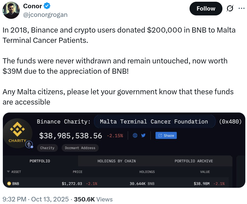 Conor Grogan at Coinbase flagged it on X. https://x.com/jconorgrogan/status/1977819703579132263 He pointed to a wallet that received 30,644 BNB during a Binance Charity drive. Back then, it was worth about 37 million. Tremendous appreciation. Zero distribution.