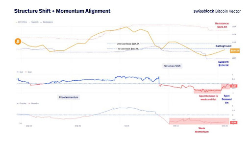 In an X post, Bitcoin Vector said BTC has entered its decisive battleground between 115,000. Spot demand was weak last week as US-China trade tensions escalated. As those tensions eased, demand showed up again and BTC clawed back above $110,000. Momentum is still negative and flat. Without sustained inflows and real spot demand, the bullish structure can fade fast and open another pullback. If demand holds and momentum turns up, BTC advances deeper into the zone. If it fails, the market retreats and waves the white flag.