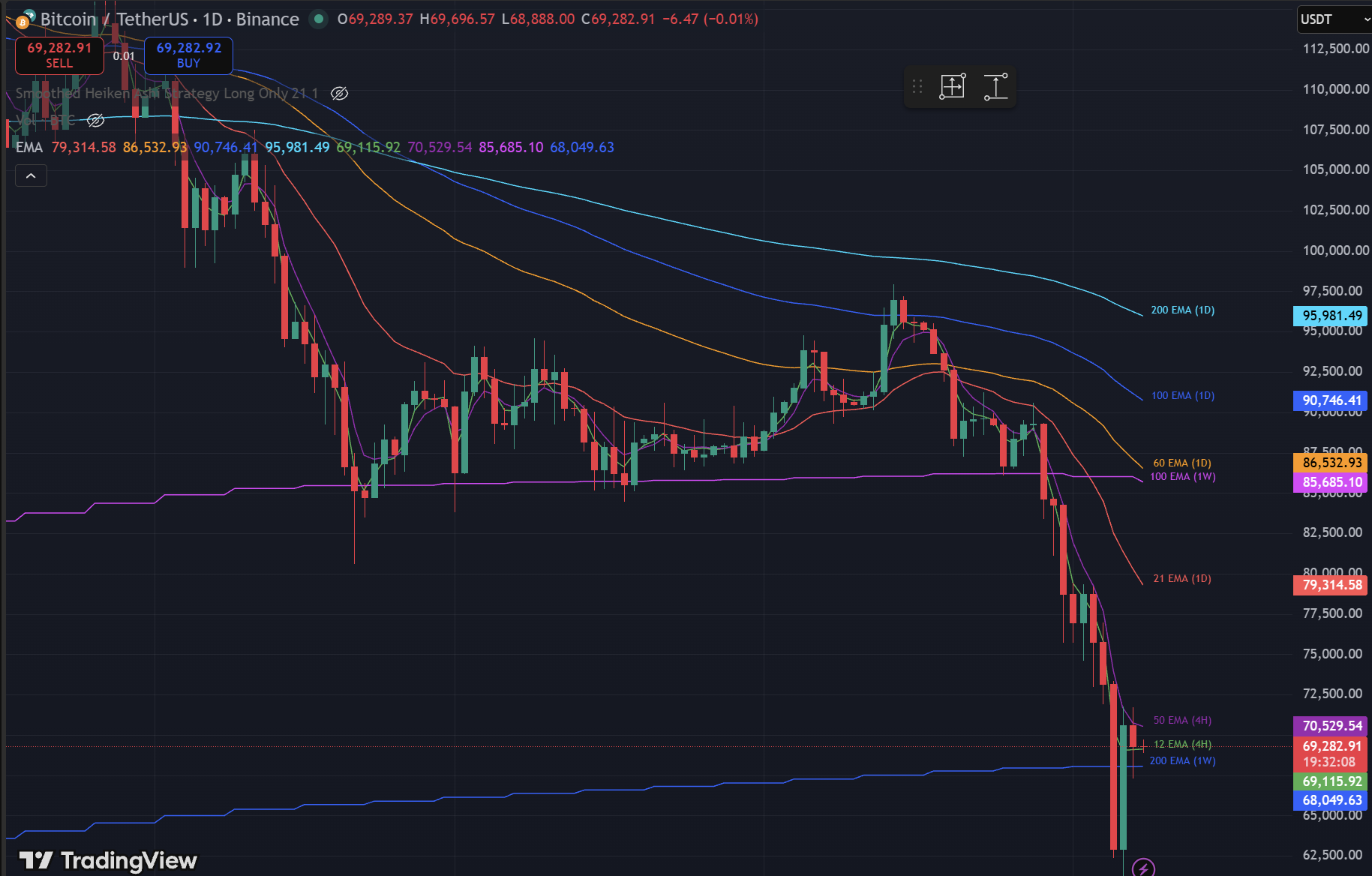 The Kill Zone: The 62,000 range is the last line of defense. This zone represents the 200-week Moving Average support.