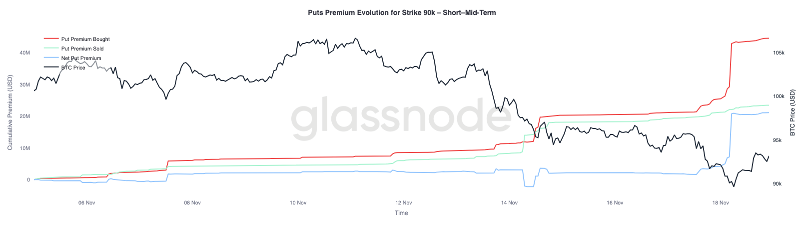 The 90,000-dollar strike shows the strongest pivot. As Bitcoin broke below 93,000, traders lifted premiums on 90K puts sharply. This concentrated demand pushed short-term implied volatility higher and reinforced the market’s defensive posture.