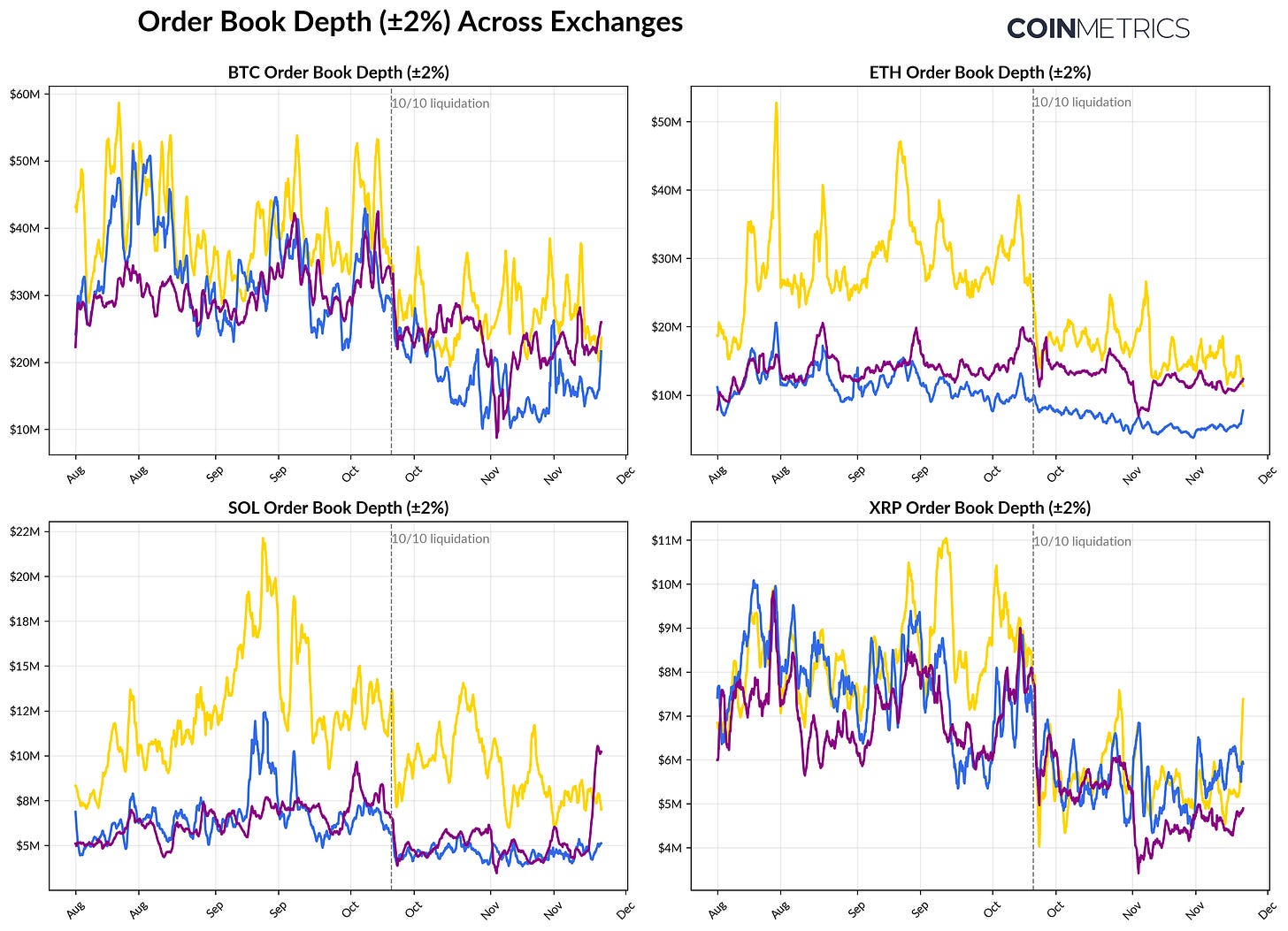After the big liquidation event, order books across major exchanges thinned out and they have not fully recovered. Top-of-book depth, measured as the amount of BTC, ETH and SOL within 2 percent of the mid-price, is still 30 to 40 percent below where it stood before the crash. That means fewer resting bids and offers. In a structure like that, even modest bursts of buying or selling can move price a lot, increase realized volatility, and magnify the impact of forced flows.