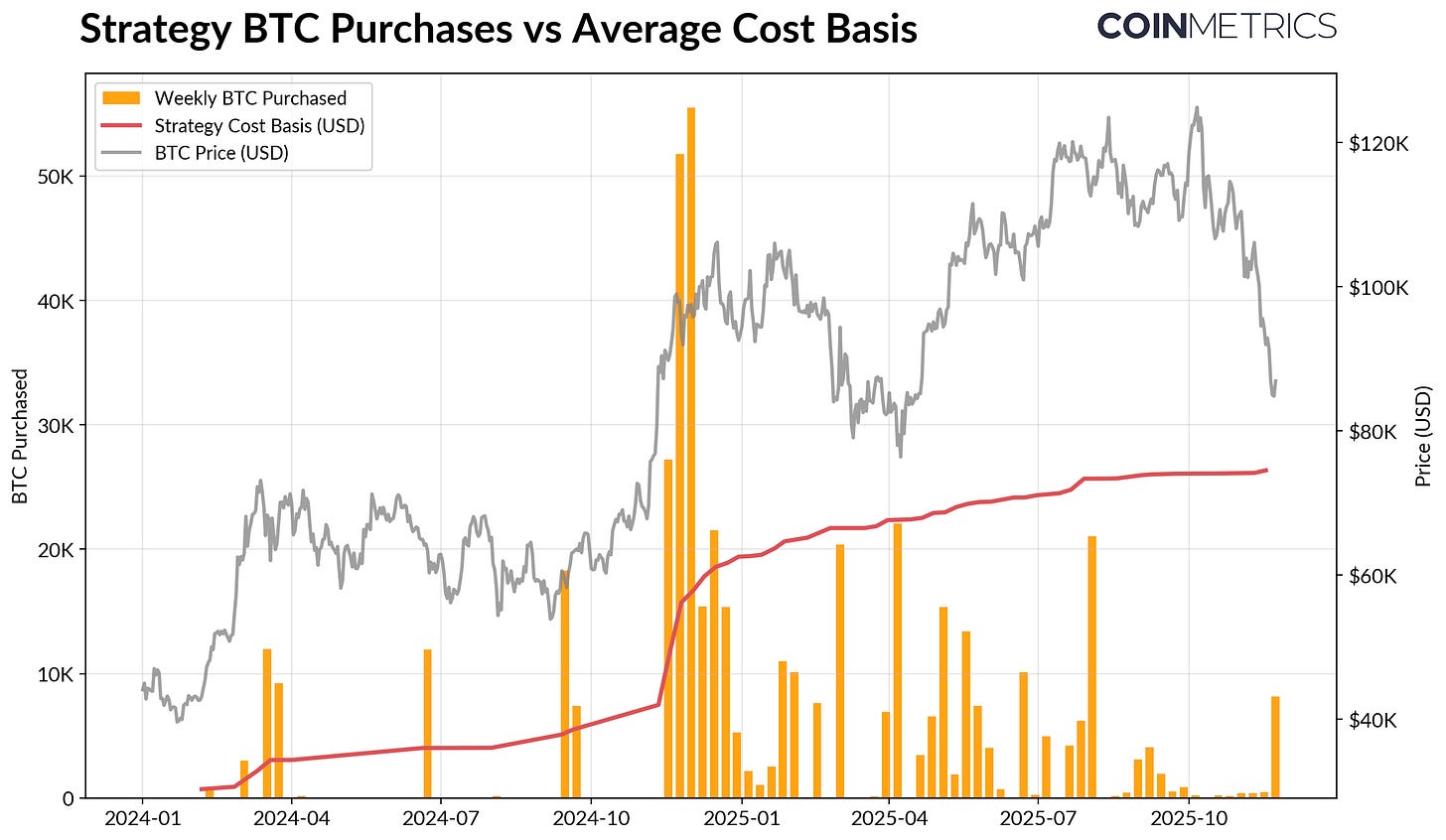 Strategy, the largest DAT, currently holds 649,870 BTC, about 3.2 percent of Bitcoin’s supply, at an average cost of $74,333. Its BTC accumulation ramped up aggressively while prices were rising and its stock valuation was strong, then slowed sharply as market conditions turned. It has not become a major net seller, and it still sits on unrealized gains with cost basis below spot. But the easy mode of aggressive accumulation is on pause.