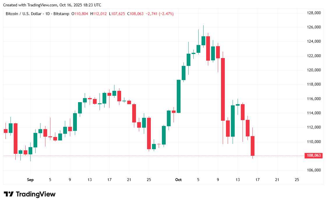 Bitcoin was down 2.98 percent at 107,642.18 and a 24-hour high of $111,990.81, per Coinmarketcap. The weekly change was negative 10.73 percent.