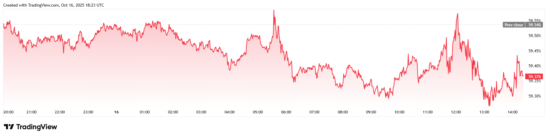Twenty-four-hour volume rose 12 percent to 2.15 trillion. Bitcoin dominance slipped 0.19 percent to 59.38 percent.