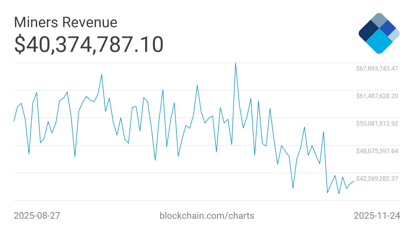 Average 7-day miners’ revenue has already dropped 35 percent, from about 40 million over the past two months. At current BTC levels below $90,000, this is not a thriving industry. It is a cornered one.