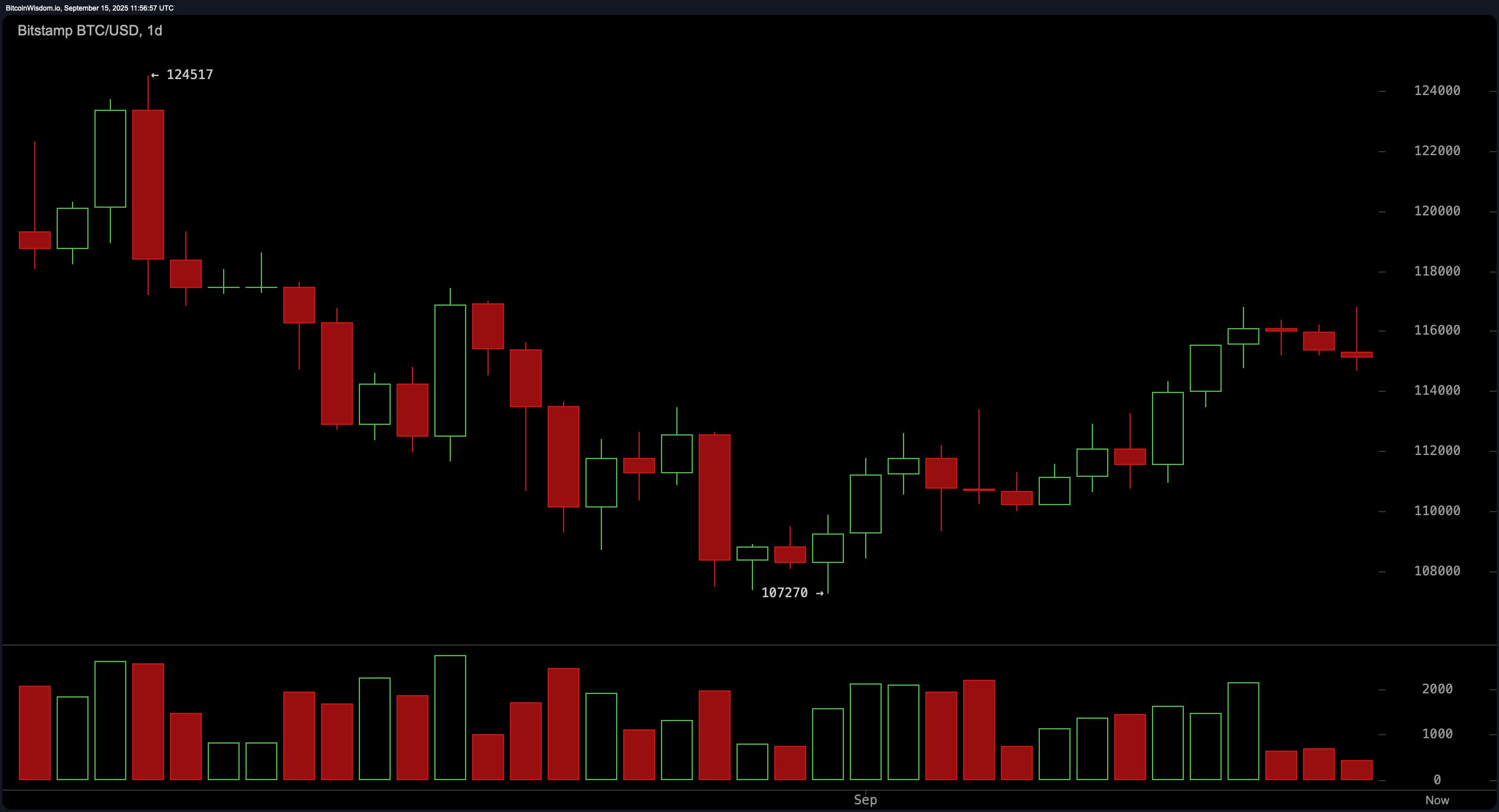 Bitcoin traded at 115,051 as of Sept. 15, 2025. Market cap stood at 2.29 trillion. The 24-hour volume hit 39.26 billion. The intraday range was 114,790 to $116,689. That is tight. That is a spring.