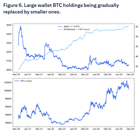 Citi’s latest note points to the core driver. Whale cohorts are shrinking while small holders add. It fits the late-cycle playbook. Smart money sells to the newcomers. Since August, whales sold about 147,000 BTC, worth roughly 16 billion dollars. Addresses with more than 1,000 BTC declined. Sub-1 BTC wallets rose. Glassnode’s breakdown shows entities with more than 10,000 BTC are in clear distribution. The 1,000 to 10,000 cohort is broadly neutral. Net buying comes from smaller, allocation-driven investors who tend to hold longer.