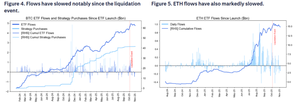US spot bitcoin ETF inflows slowed sharply in recent weeks. That surprised many who thought ETF flows would be insulated from futures and DEX liquidations. Ether ETFs cooled as well.