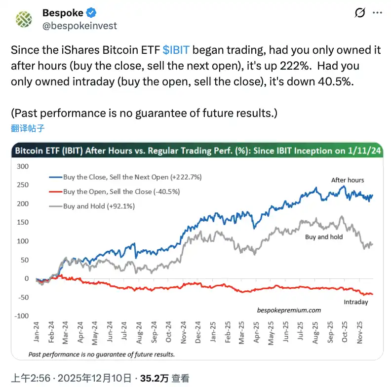 One of the more revealing observations is the time-of-day split: Bitcoin has looked weaker during US cash hours, while the after-hours window has carried most of the upside since IBIT began trading, based on the cited Bespoke data. That is a sign that large flows are influencing the tape in predictable windows. If you are trying to time entries, this matters more than vibes.