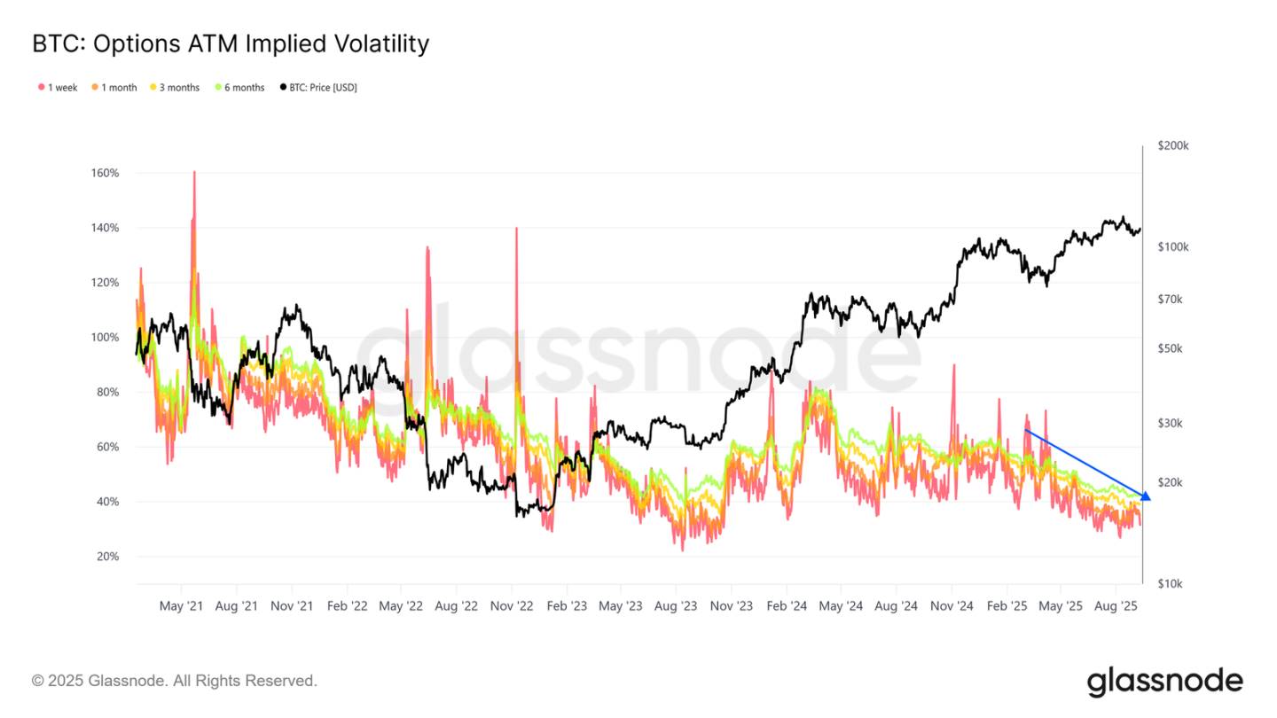 Implied volatility keeps grinding lower. A deeper market sells vol, which presses IV down and smooths price action compared with past cycles.