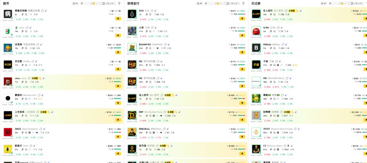 They use XHunt’s new BNB Feed with AI summaries and alerts for 24 by 7 reactions. They scan PancakeSwap and Aster order books for sudden volume in new tickers. They try Binance Wallet’s Meme Rush. It is a Launchpad built with Four.meme, limited to KYC’d Web3 wallet users inside the Binance app, with higher internal migration limits. The interface groups projects into New, Upcoming, and Migrated. New is noisy and early. Upcoming lists names moving from inside to outside with committed buy demand. Migrated is accessible to everyone and tends to be the higher quality set.