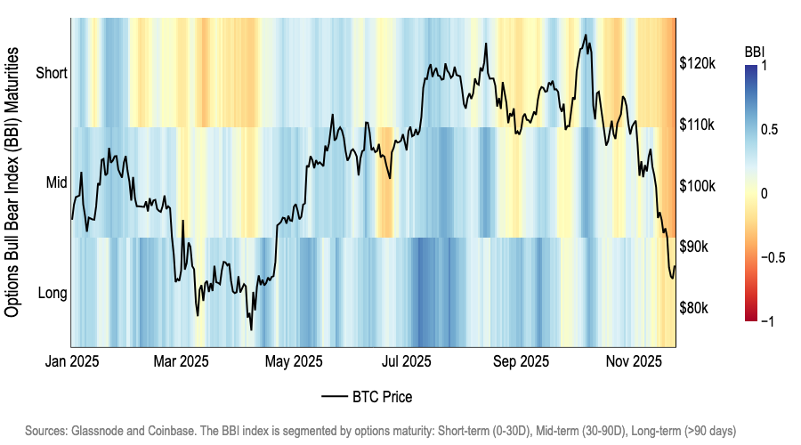 Derivatives are telling the same story. The options Bull-Bear Index, which tracks whether traders are paying up for calls or puts, has turned clearly negative at short maturities and slipped into bearish territory at the 30–90 day bucket. Only the long-dated tenors sit closer to neutral, which looks more like uncertainty about the path to 2026 than conviction in a full-blown bear market.