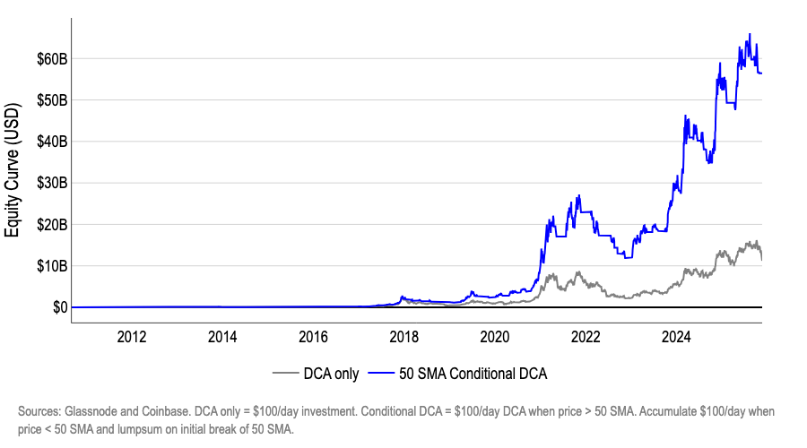 In this environment, the old mantra of “buy every dip forever” is getting an uncomfortable stress test. A long-horizon backtest from 2010 to late 2025 shows that blindly allocating a fixed dollar amount into BTC every day dramatically underperforms a simple trend-aware variant. An investor who only DCA’d while price traded above the 50-day moving average, parked cash during downtrends, and deployed that cash when price reclaimed the 50-day line would have ended up with an equity curve roughly five times larger than naive DCA.