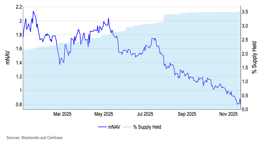 Digital asset treasuries have cooled as well. Market-value-over-NAV ratios for major listed BTC vehicles, including MicroStrategy, have slipped below parity for the first time since 2024, even as these entities collectively hold around three and a half percent of supply. Persistently sub-1.0 readings invite shareholder pressure to slow new purchases, hedge, or even sell into strength to close the discount.