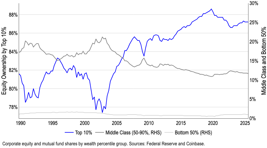 For crypto, that matters because almost all the financial firepower is concentrated at the top. CNBC data show that the richest ten percent of US households hold close to ninety percent of domestic equities, and a similar skew applies to digital assets. Those same groups are now benefiting from an AI-driven jump in productivity and stock prices, while headlines highlight white-collar layoffs and the squeeze on middle management. Corporate margins improve, but household income security for large swaths of potential retail buyers deteriorates.