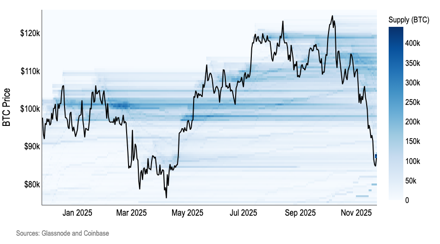 The 98–100k region was the core onchain “battlefield” where a large cluster of holders shared a similar cost basis. Once price smashed below that, the realized price distribution thinned out. There are simply fewer addresses with strong economic reasons to defend the zones immediately underneath.