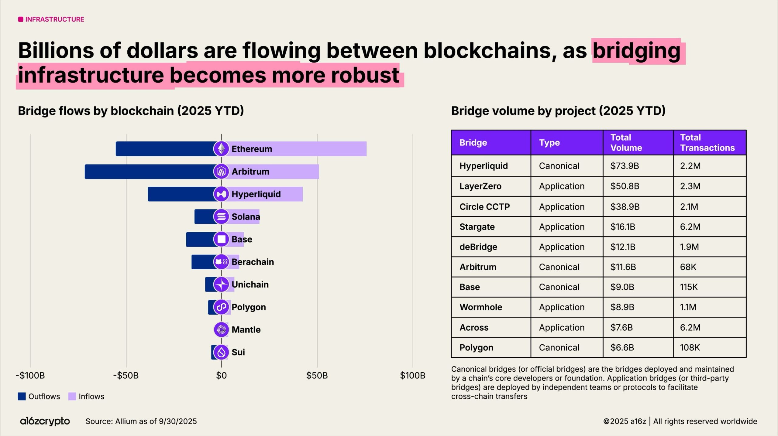 Bridges stitch the multichain world together. LayerZero and Circle’s Cross-Chain Transfer Protocol move assets across ecosystems. Hyperliquid’s canonical bridge reached $74 billion year to date.