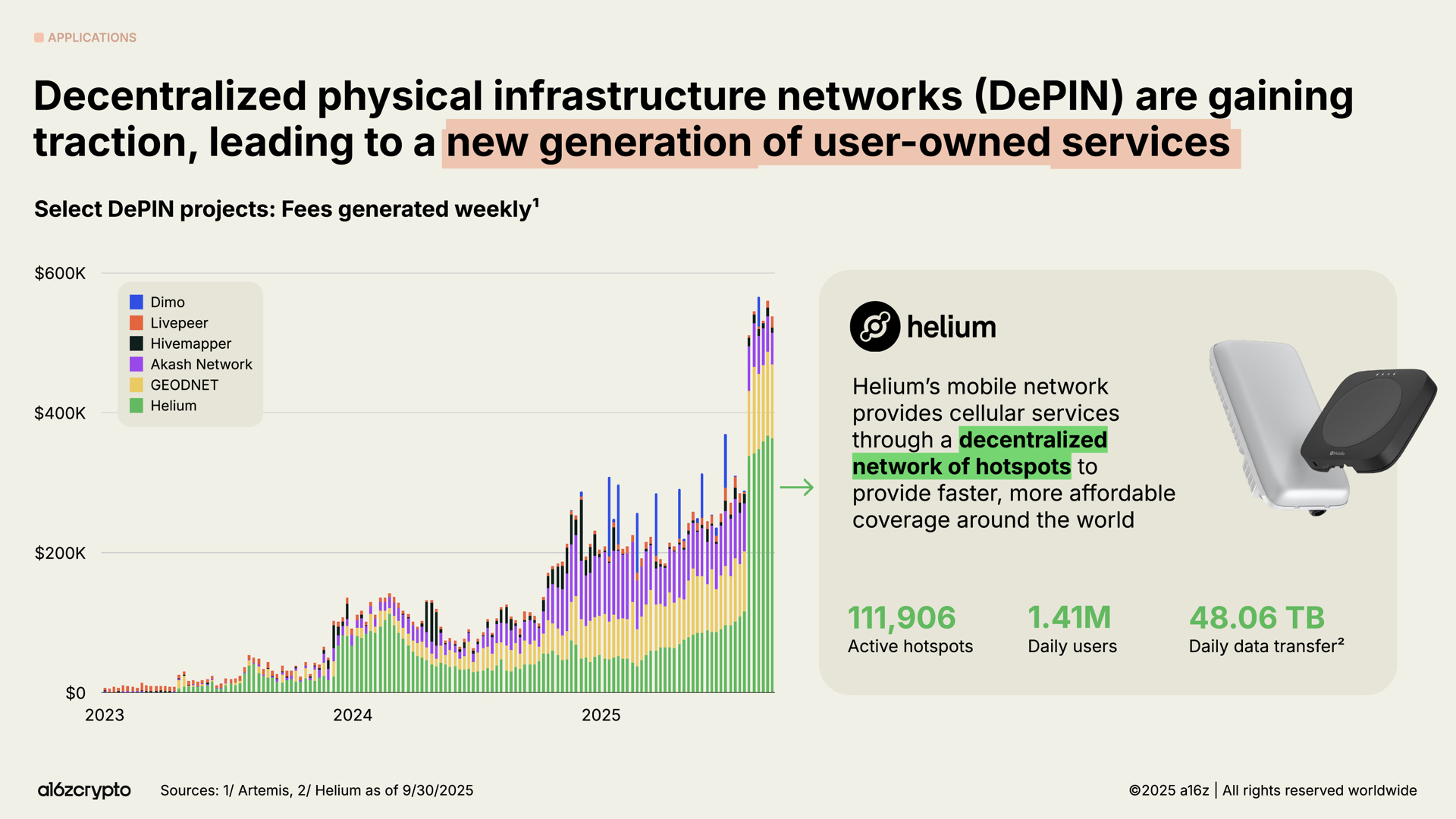 DePIN became tangible. Helium’s grassroots 5G network serves 1.4 million daily users across more than 111,000 hotspots. Big, ambitious, and live.
