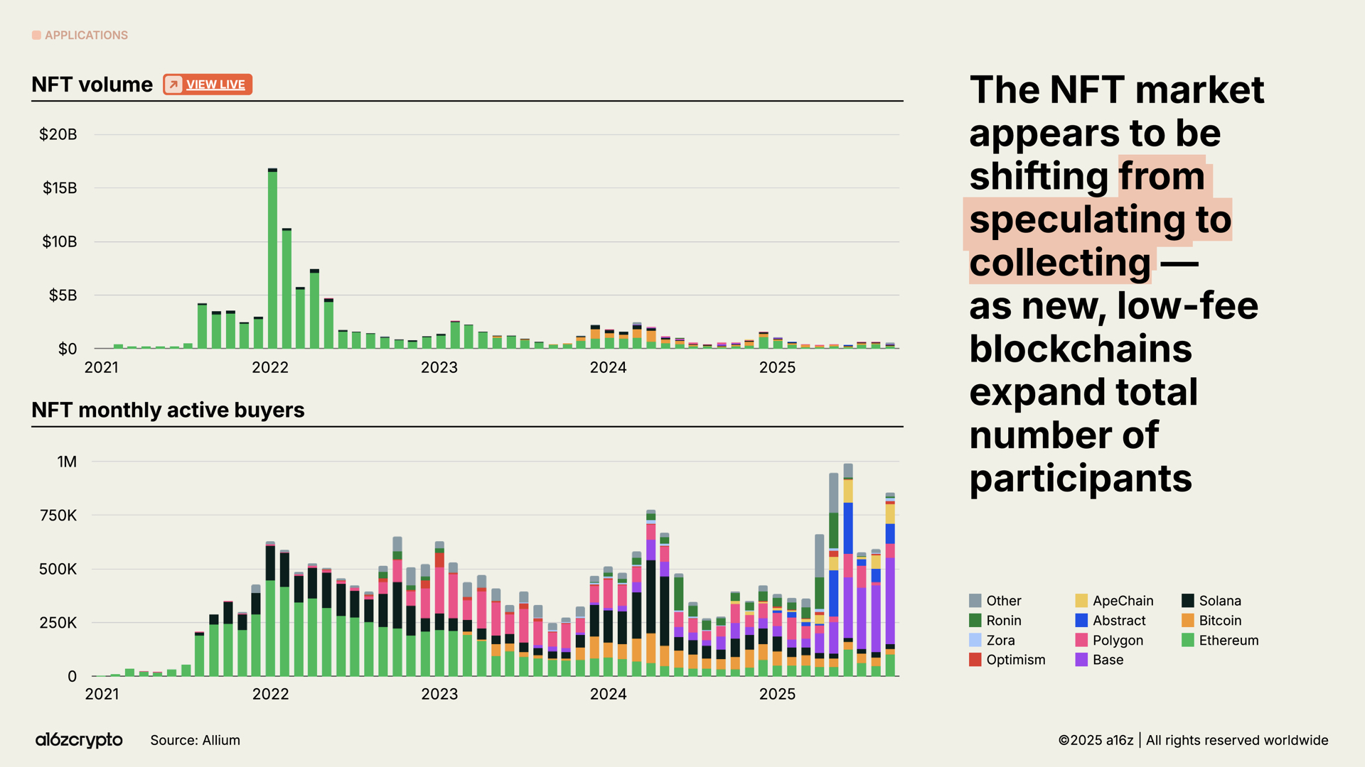 NFT volume is below 2022 peaks, but monthly active buyers are rising as cheaper blockspace on Solana and Base makes collecting practical again.