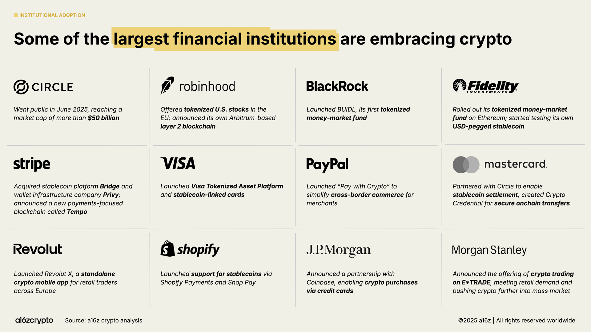 Citigroup, Fidelity, JPMorgan, Mastercard, Morgan Stanley, and Visa now offer or plan consumer crypto products. PayPal and Shopify are deepening payments. Circle, Robinhood, and Stripe are developing new chains for payments, RWAs, and stablecoins. Distribution is massive. Integration into daily finance is underway.