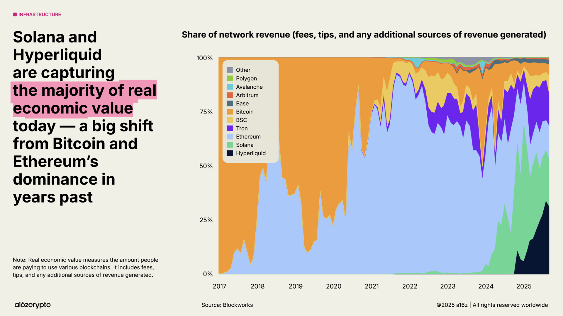 “Real economic value” shifted too. Hyperliquid and Solana now account for 53 percent of revenue-generating activity. That is a dramatic rotation from the old BTC and ETH dominance.
