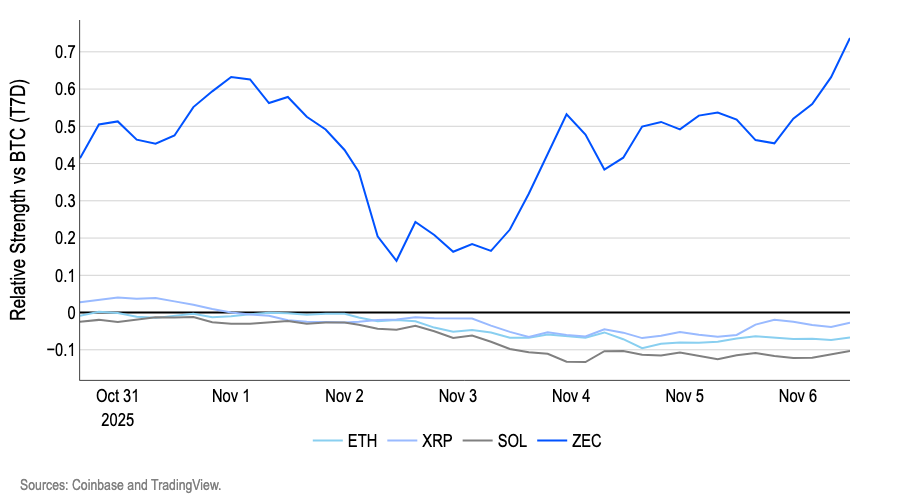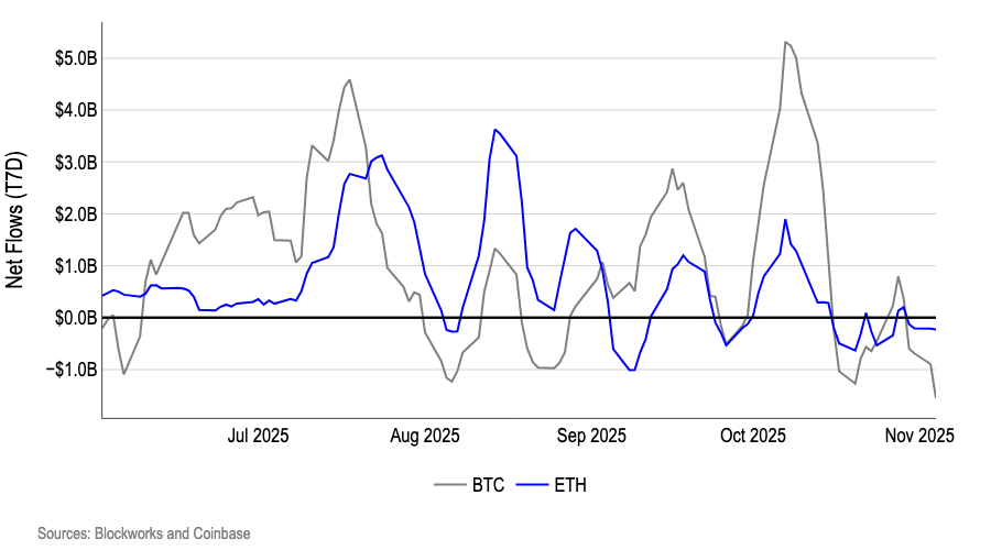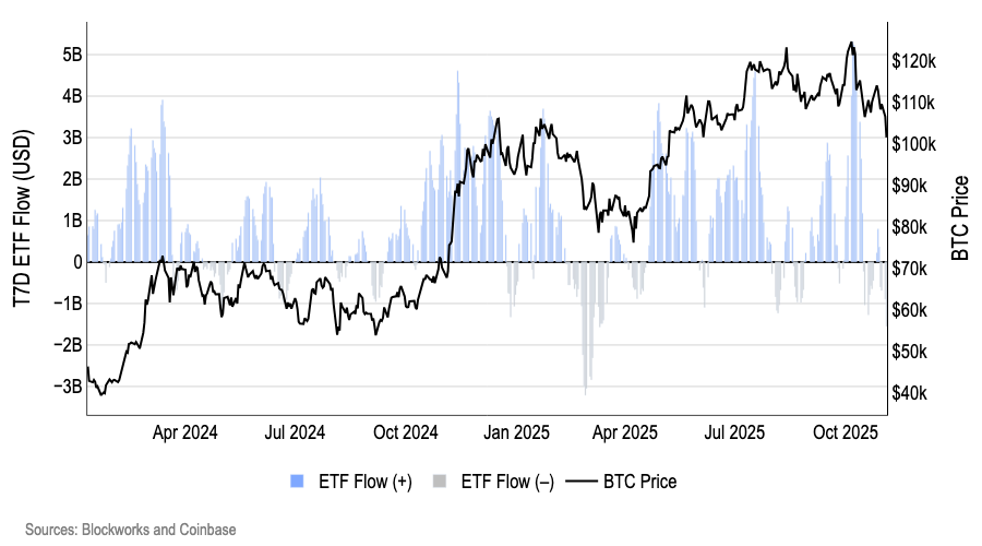 ETF flows have not helped. The trailing seven-day sum for U.S. spot ETFs is negative. Several days of outflows hit late October into early November. A single day of inflows near $100,000 was not enough to shift the trend. As long as BTC trades below key support levels, spot ETF demand is likely to stay uneven.