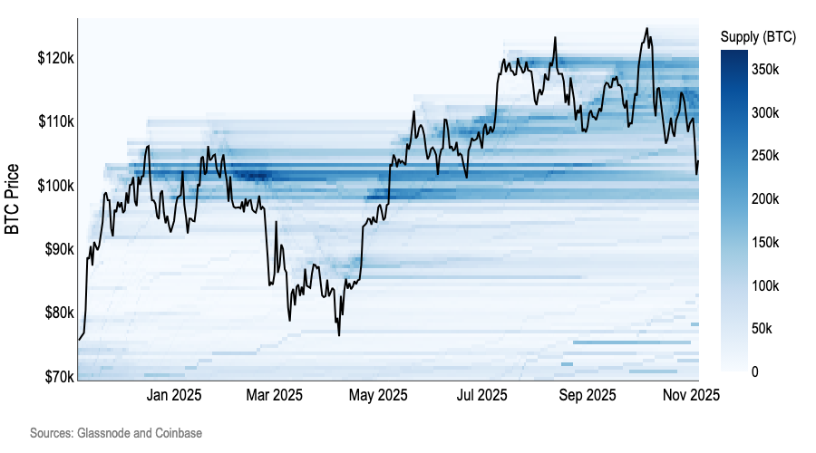 The cost basis distribution reinforces the stakes. A thick cluster of supply sits between 100,000. The longer price hovers below that zone, the more likely “weak hands” may trim exposure or capitulate. If the range breaks cleanly to the downside, the lighter acquisition density beneath it suggests fatter left-tail risks for dip buyers.