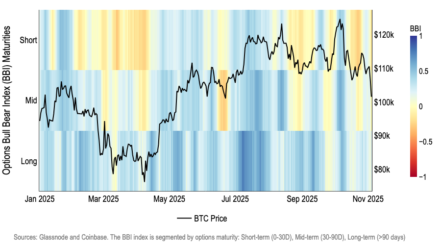 Options data shows the same caution. The short-dated Bull-Bear Index leans bearish, mid-term is flat, and long-dated skews slightly bullish. Investors are protecting against downside first, chasing upside later. Nobody is showing aggressive conviction.