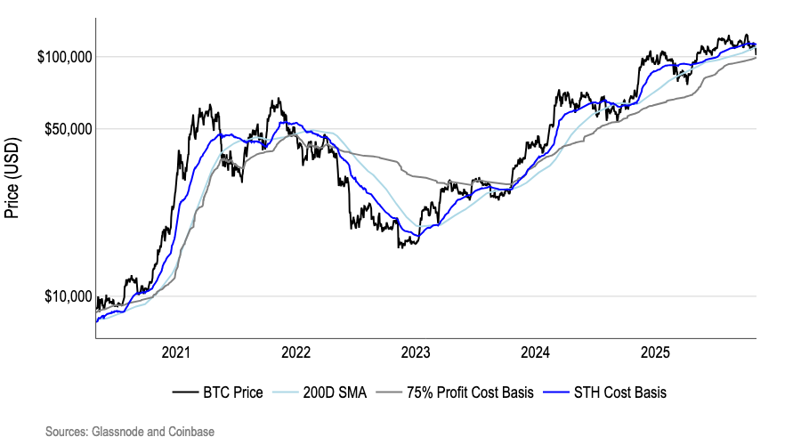Bitcoin slipped below $100,000 for the first time since June, hitting a round-number level loaded with psychological and structural significance. Price is also trading under two major bull-market support bands: the 200-day simple moving average and the short-term holder cost basis. When spot sits under STH cost, newer market entrants are underwater. Historically, this makes them less eager to buy dips and more likely to sell into rallies.
