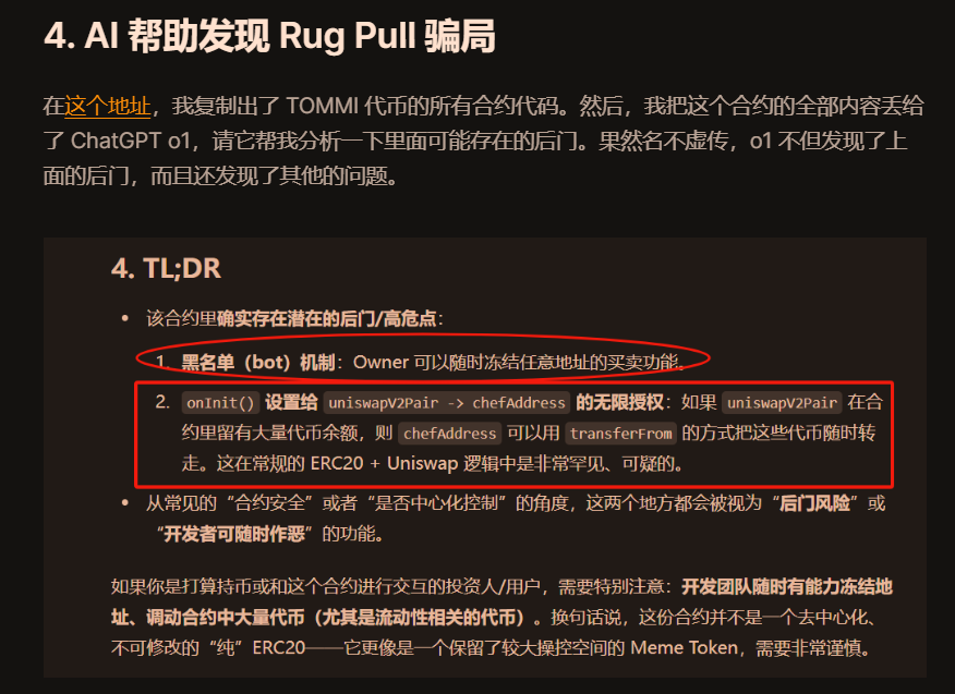 Then push deeper. Ask an LLM to explain the code paths. Spot backdoors. Spot blacklists. Spot mint authority. Yes, even “hundred-bagger” memes can hide a kill switch.
