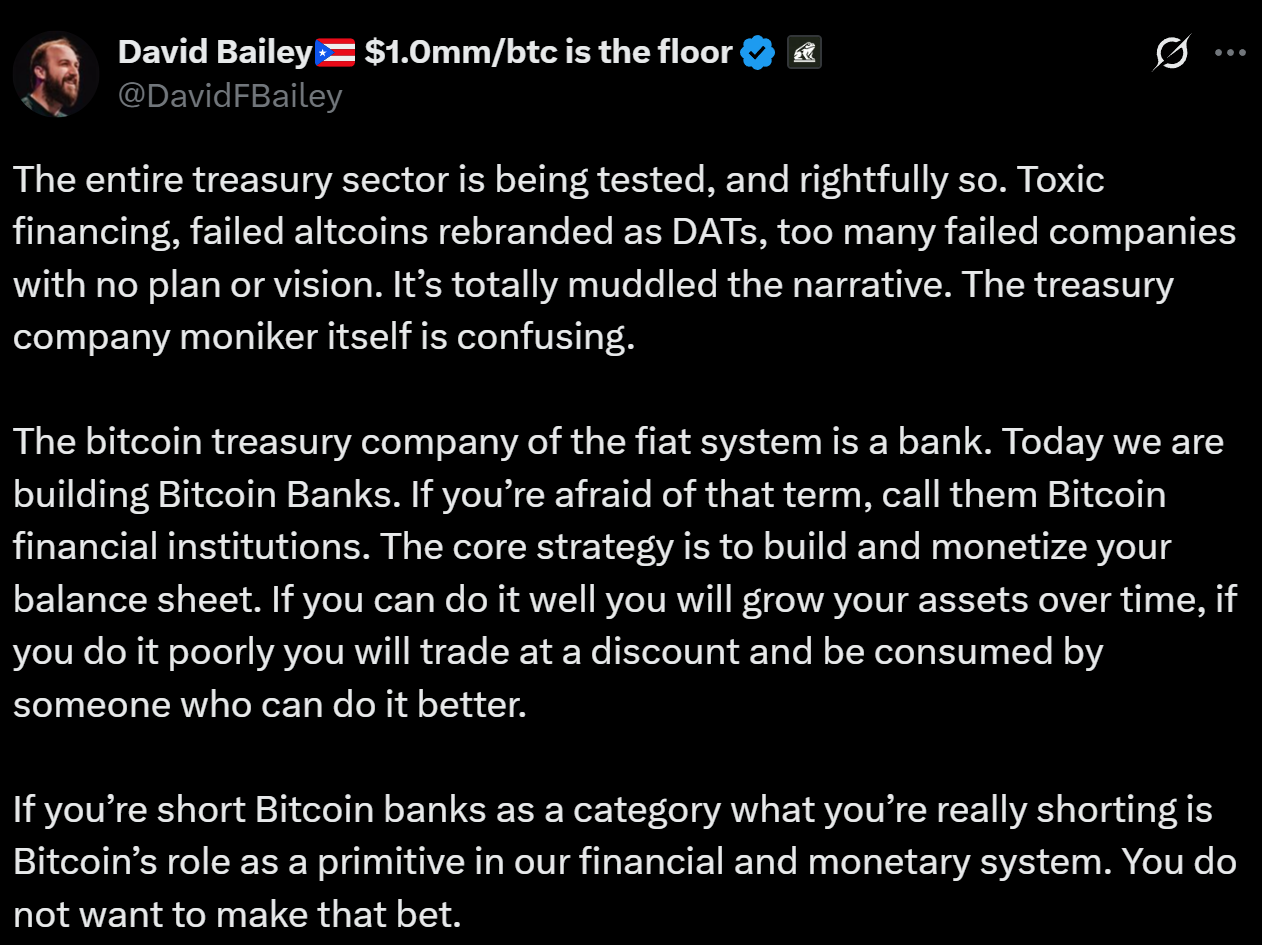 David Bailey says so. The Nakamoto CEO argues that “digital asset treasury company” is a confusing label. The field drifted. Toxic financing crept in. Failed altcoins got rebranded as DATs. Too many failing firms. No plan. No vision. He said it plainly in his X post.