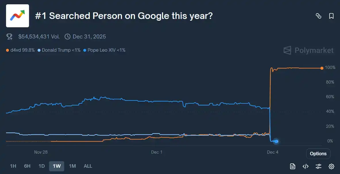 At the moment Year in Search went live, the top slot did not belong to the pope or Trump or any other front runner. It went to the previously ignored d4vd. On Polymarket the chart went vertical. In seconds, d4vd’s line rocketed from the bottom of the probability range to almost one hundred percent while every other contract collapsed to zero.