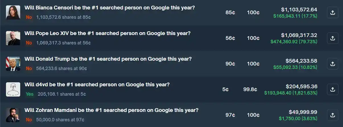 When Polymarket listed a contract on “who will be Google’s most searched person of 2025,” traders treated it as a celebrity horse race. The usual suspects dominated the early odds: the pope, Donald Trump, Taylor Swift, Elon Musk, a handful of big political names. Buried at the bottom of the screen sat a row of obscure entries like d4vd, Mikey Madison and Andy Byron that barely registered as more than noise.