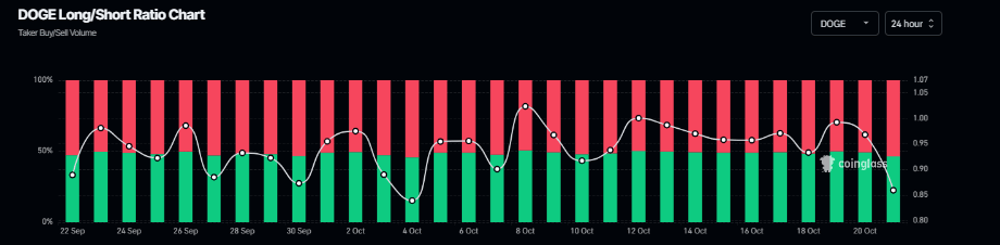 CoinGlass also shows more traders are betting against both tokens. The long-to-short ratio for DOGE stands at 0.85 and for SHIB at 0.87, signaling heavier short exposure and deepening bearish bias.