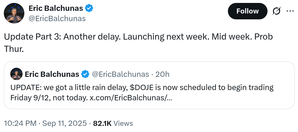 A Sept. 8 SEC filing said the Rex-Osprey DOGE ETF, ticker DOJE, was expected to list Friday, Sept. 12, alongside Bonk, XRP, Bitcoin and Trump Official ETFs. Bloomberg’s Eric Balchunas said Thursday the listing is delayed again, likely to the middle of next week, probably Thursday. He learned of the delay from the issuer. No reason was given.