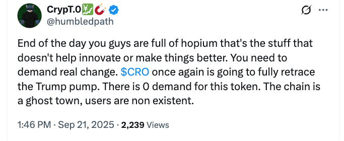 The market cap told the story. Cronos shed more than $6 billion since the peak, losing roughly half its value and sliding to the 33rd spot among crypto assets. Traders questioned whether Trump Media’s involvement could sustain real demand. “There is 0 demand for this token. The chain is a ghost town, users are non-existent,” one X commentator said. Another Reddit user added, “We’re getting rugged, just as I expected when that partnership was announced.”