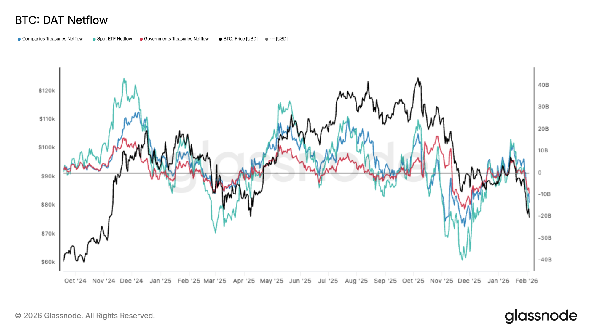 This is the most bearish chart in the deck. The ETF and Treasury Netflows—the engine of the 2024-2025 rally—have flipped to net outflows. The "passive bid" that traders relied on is gone.