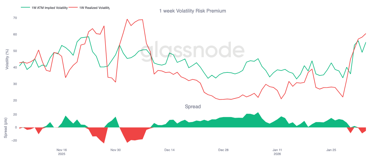 The Volatility Risk Premium (VRP) has flipped negative (-5). This is rare. It means IV is trading below realized volatility. Options sellers are losing money and forcing hedges, which adds mechanical selling pressure to the market.