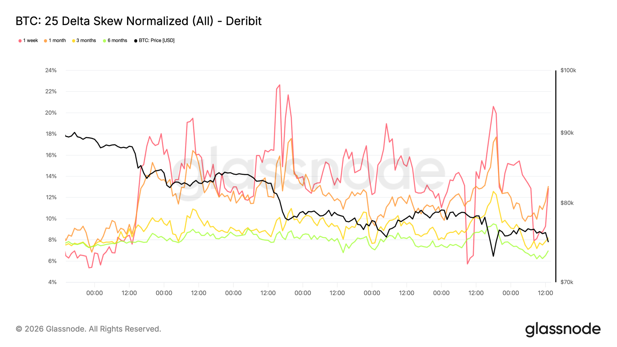 The options market is screaming caution. Short-dated Implied Volatility (IV) spiked to 70% as price tested $73k. Traders are paying up for near-term protection.