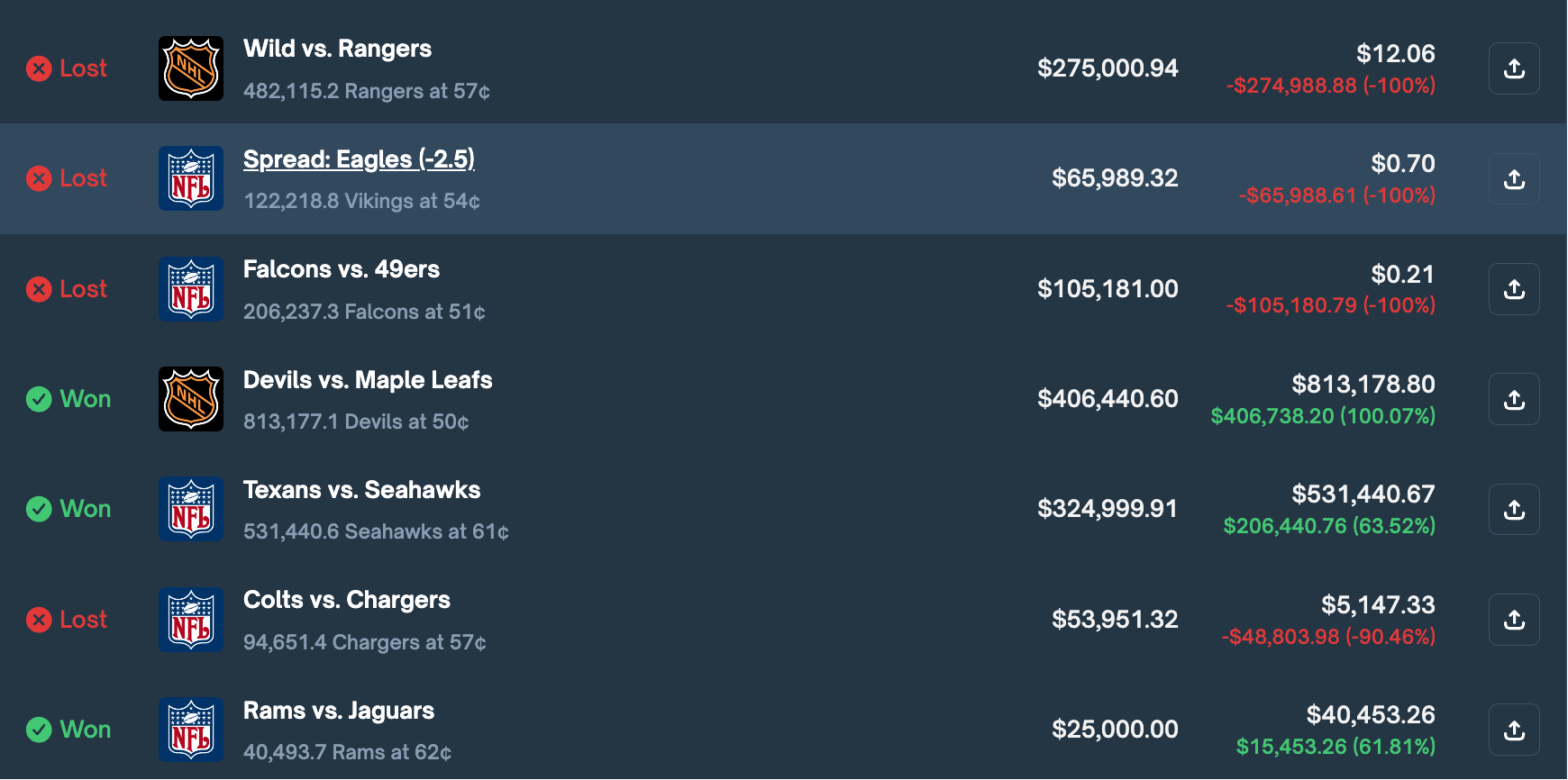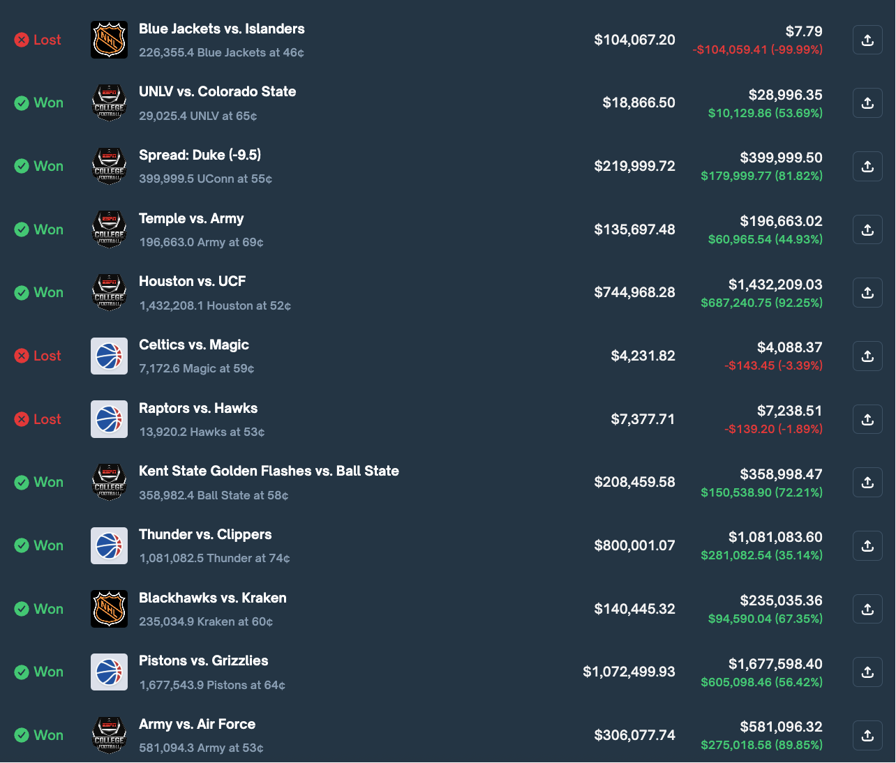 After that taste of blood, he expanded fast. From LOL, he moved into the big American sports circuits: college football (CFB), the NHL, the NBA, the NFL and more. Early on, the run looked unstoppable. In five college football games and two NHL matchups, multiple entries on the same markets produced returns between roughly 30 and 82 percent, with his best single profit around 360,000 dollars.