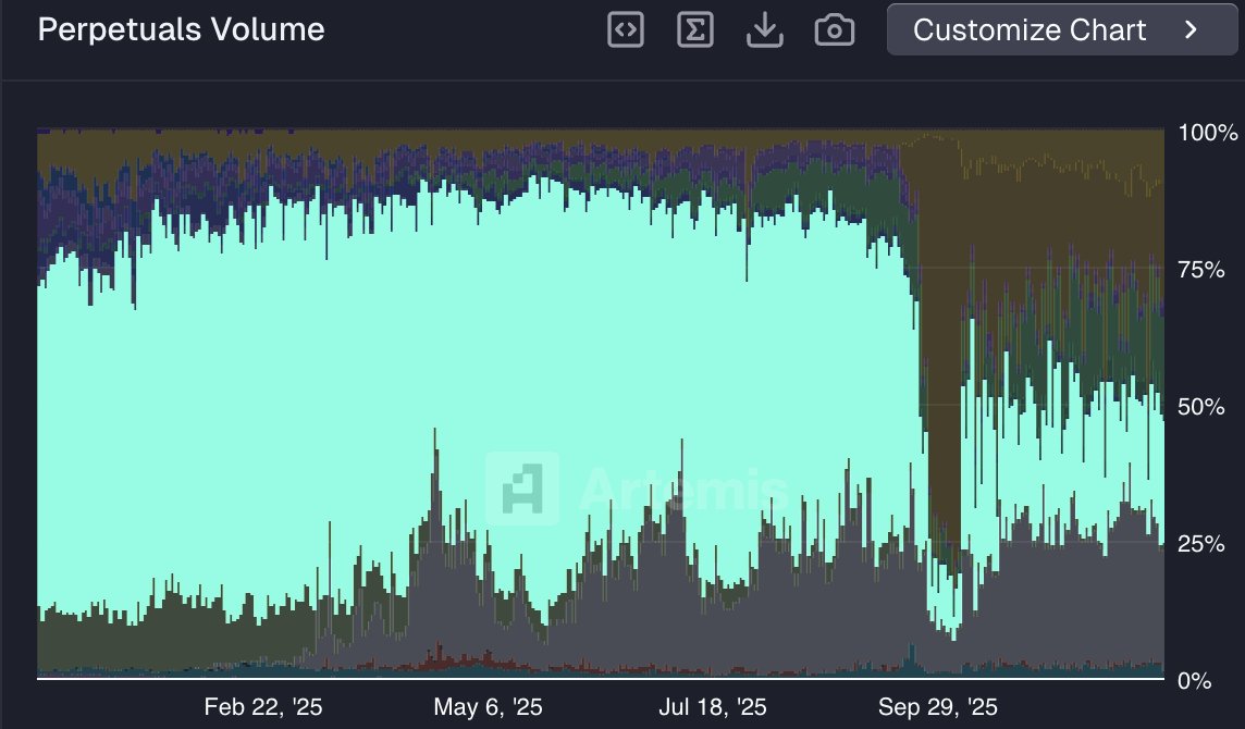 Spot listings and HyperEVM support widened the product surface. Builder codes and early infrastructure proposals like HIP-2 invited third party experiments while preserving a clean core experience. For more than a year, market share climbed almost in a straight line. By late spring 2025, tracking from @artemis showed an environment where Hyperliquid’s lead looked untouchable.