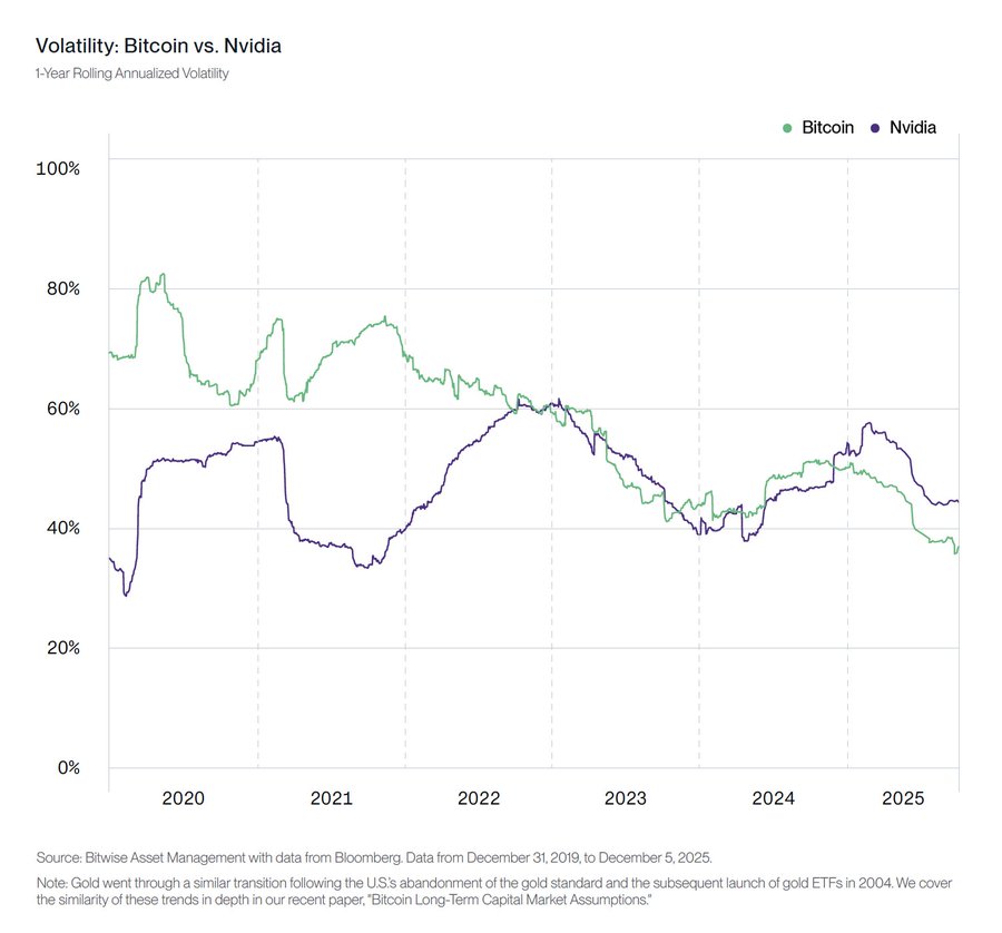 This is the most damning stat for the gambling addict. Bitwise predicts that by 2026, Bitcoin volatility will drop below Nvidia.