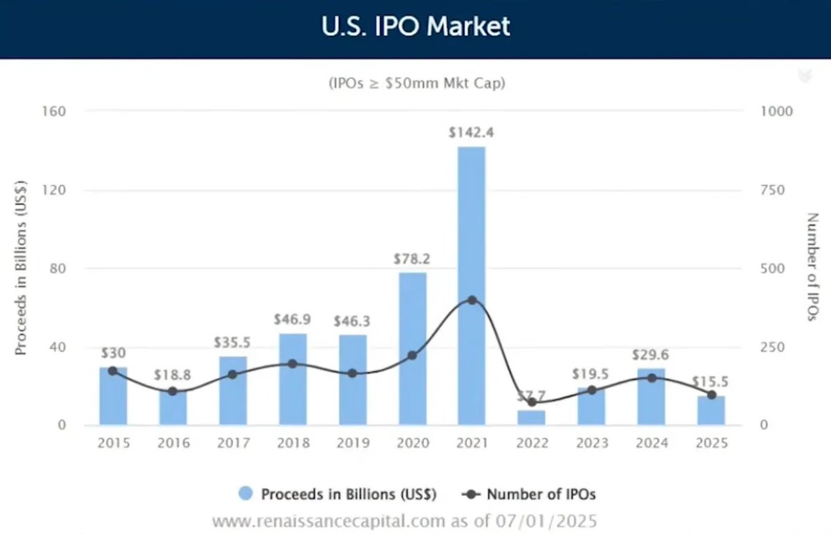 Equity markets once powered American capitalism. Now they fail the broad base of enterprise. Public issuance sits near multi-decade lows, while private credit assets have surged past $1.7 trillion. Companies lean into debt because public markets are broken. Liquidity is thin, passive ownership is dense, and asset-heavy models get hit with punitive multiples. Listing looks uneconomical.