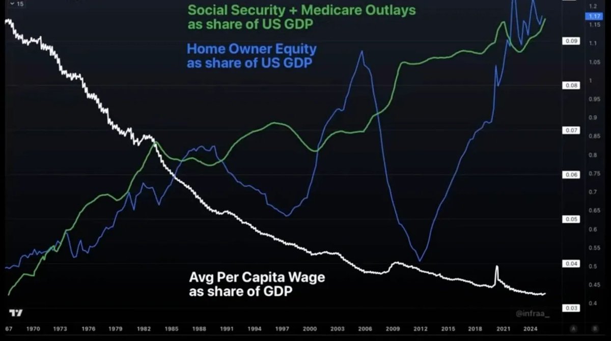 The social contract shows the bill. Asset wealth soars as real wages stagnate. Housing and equities claim a record share of GDP. Without broader ownership, not transfers but true participation, stability frays. Populism rises. Protectionism returns. Tariffs and industrial nationalism reflect economic exclusion. The U.S. is not immune. It is leading the experiment.