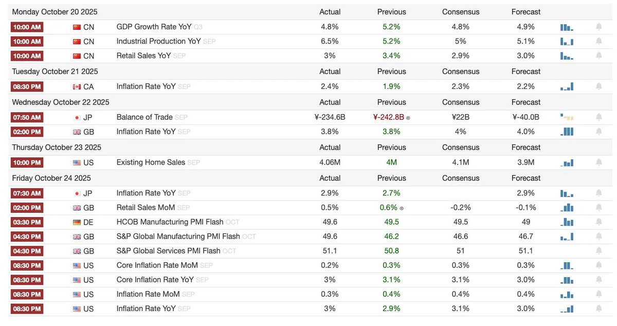 The market overview is simple. The U.S. economy sits in a holding pattern. A prolonged government shutdown clashes with upcoming CPI data. Policy paralysis and inflation prints drive the near term. Global growth signals are soft but maybe stabilizing. China’s GDP and Eurozone PMIs will shape whether momentum is bottoming. Trade tensions between the U.S. and China remain the wildcard. Contained for now, but a tariff or rare-earth shock could move fast.