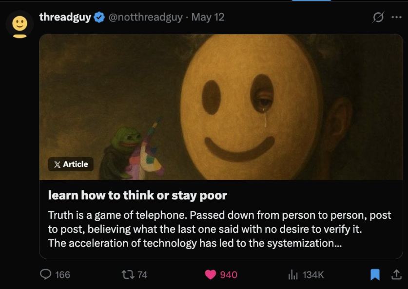 You need your own take. Your own map. Your own clock. The pros buy before the thread. They test the idea, build the position, then speak. The crowd rushes in and hands them liquidity. The game rewards thinkers, not parrots.